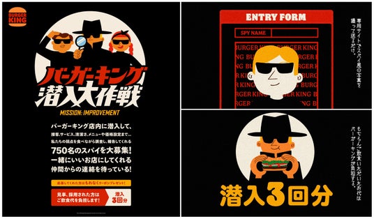 バーガーキング(R) 店内に潜入して、接客、サービス、清潔さ、メニュー、価格設定など店舗の弱点を調査し、報告してくれる750名のスパイの皆様を募集いたします。「バーガーキング(R) 潜入大作戦」 特設WEBサイトの応募フォームより必要事項を記入の上、エントリーください。