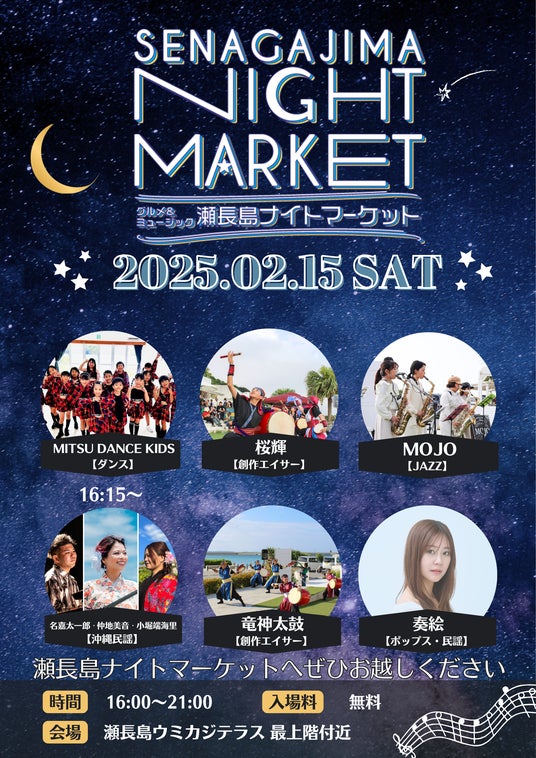 リゾーツ琉球株式会社(沖縄県豊見城市)が運営する瀬長島ウミカジテラスは約7年ぶりに瀬長島で夜のイベント「瀬長島ナイトマーケット ~グルメ&ミュージック~ 」を開催いたしました。会場には沖縄県民がうなる絶品グルメが勢ぞろいし、ライブステージでは人気アーティストや地元の創作エイサー団体が熱いパフォーマンスを披露。美味しいグルメを味わいながら、音楽に身を委ねる贅沢なひとときを多くの来場者が楽しみました。