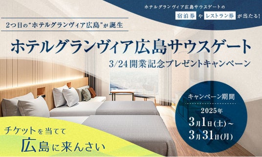 株式会社ジェイアール西日本ホテル開発(京都府京都市下京区、代表取締役社長 伊勢 正文)は、運営するJR西日本ホテルズ13施設目の新ホテル「ホテルグランヴィア広島サウスゲート」の開業を記念し、クイズに回答いただいた方を対象に、ホテルグランヴィア広島サウスゲートで使えるペア宿泊券やペアランチ券が抽選で当たるキャンペーンを3月1日(土)から開催いたします。