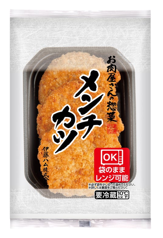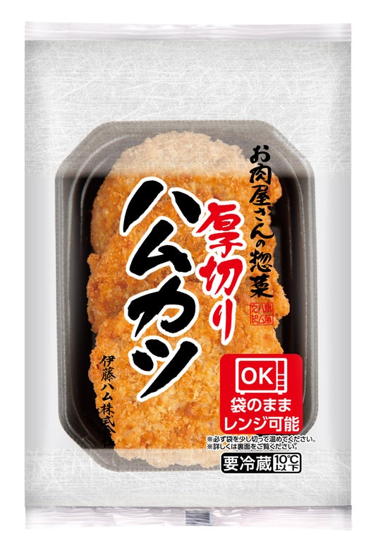 袋のまま電子レンジ調理が可能な、食べ切りサイズ4品「厚切りハムカツ」「メンチカツ」「チーズ入りチキンカツ」「ヒレ肉使用トンカツ(成型肉)」です。簡単に温められるので、忙しいときのごはんのおかずや、さっと食べたいおつまみにお薦めです。デザインを縦型にすることで、売場の省スペース化にも貢献します。