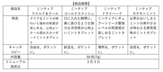 合わせて「ミンティア」のレギュラーシリーズ主力4アイテム『ミンティア ワイルド&クール』『ミンティア コールドスマッシュ』『ミンティア ドライハード』『ミンティア カテキンミント』を3月3日からパッケージデザインをリニューアルして発売します。