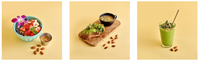 参加全店舗は、それぞれのジャンルで、美容健康効果の高いアーモンドをオリジナルレシピに組み込みました。例えば、アーモンドの1日分の摂取目安量約23粒を使用した「ホームメイドアーモンドミルク23スムージー」(SYNdicade cafe)や、通常はひよこ豆で作られるフムスをアーモンドで作る新提案「ローストアーモンドフムスのアボカドトースト レンズ豆のスープ」(HEAVENLY Island Lifestyle 代官山)、板麩とアーモンドクリームを使用し動物性不使用の「アーモンド 板麩ミルフィーユ」(BiO cafe)など、アーモンドの多種多様な活用提案が楽しめます。