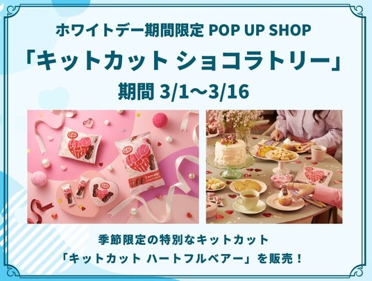 ホワイトデー期間限定で、「キットカット ショコラトリー」が出店します。厳選素材の特別なキットカットや、バレンタインホワイトデーシーズンにしか手に入らない人気商品“クマ型キットカット”「キットカット ハートフルベアー」を販売します。