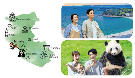 日本一の梅の里として知られる和歌山県みなべ町は、和歌山県の中央部に位置し、海・山・川と田畑が広がる、ゆったりとした時間が流れる町です。近隣には温泉や世界遺産・熊野古道の他、パンダで有名な白浜アドベンチャーワールドなどの観光地があり、海と山の美味しいグルメもたくさん!
