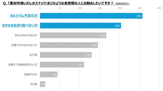 *5 質問:Q「素材市場いわしのスナック」をご試食いただき、どのような食習慣の人にお勧めしたいですか?(複数回答可)結果:管理栄養士258名が「カルシウム不足の方」、204名が「さかなをあまり食べない方」にお勧めしたいと回答
