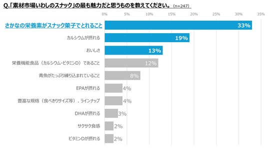 また『素材市場いわしのスナック』の魅力は、「さかなの栄養素がスナック菓子でとれること」「カルシウムが摂れる」「おいしさ」が多く、美味しいスナック菓子を食べながら、さかなの栄養素が摂れる点を高く評価(*4)いただき、「カルシウム不足の方」「さかなをあまり食べない方」におすすめしたいと回答(*5)いただく結果となりました。