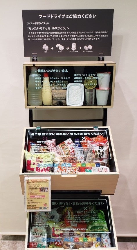お客さまから「フードドライブ」活動へのご理解と、より一層のご支援を得られるよう、店内に当社オリジナルの食品寄付ボックスを常設しております。