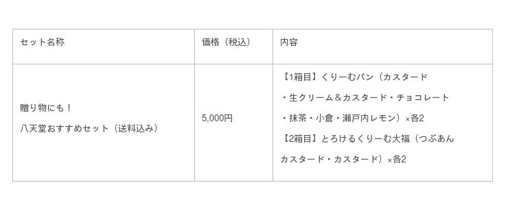「八天堂おすすめセット」は、定番のくりーむパン5種類と「瀬戸内レモン」、スプーンで食べる大福「とろけるくりーむ大福」の「つぶあんカスタード」「カスタード」をセットにしました。お祝い事での贈り物や大口でのご注文でニーズの高い、価格帯5,000円で定番くりーむパンを含むおすすめのお品を詰合せました。