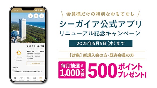 新シーガイア公式アプリにログインいただいた方の中から、毎月抽選で1,000名様に500ポイントをプレゼントいたします。