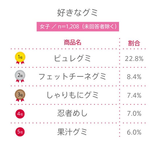 男女共通の1位は、ハートの形とすっぱいパウダーがクセになる“ピュレグミ”。特に女子は2位に3倍近くの差をつけてのランクイン。一方男子は、2位と僅差での1位となりました。