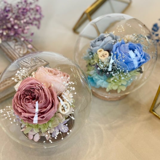 オールドローズがガラスドームの中でふわっと花開く華やかなアレンジ。バラと、ころっとした木の実、たっぷり入ったかすみ草の組み合わせがかわいいプリザーブドフラワーです。