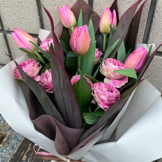 渋めのピンクで大人っぽさを演出しつつもチューリップで可愛らしさも取り入れた大人かわいい花束です。