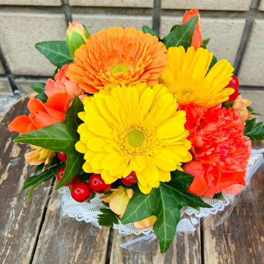 明るい雰囲気のイエロー、オレンジのガーベラをメインに、気持ちもパッと華やかになるようなフラワーアレンジメントをプレゼントしませんか。