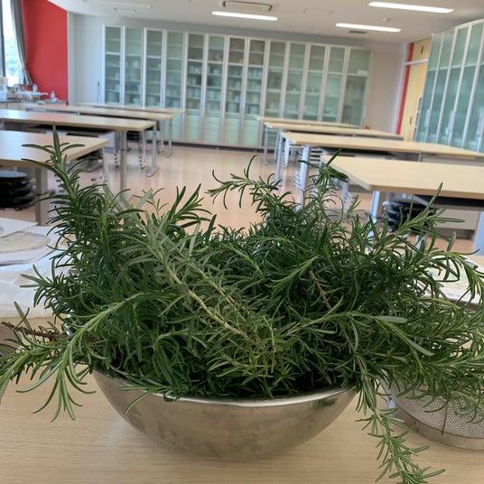 第二弾は、「新型コロナウイルスの感染拡大で沈みがちな気持ち、ストレスを減らせるような商品を作りたい」と、校内に自生しているローズマリーに着目しました。葉を細かく刻んだり煮る工程をはじめ試食を通して食味の追求もおこないました。シャーベットは、ハーブティーのような新鮮な味わいです。ジェラートは、ローズマリーの香りが目立ち過ぎず、小さなお子様にも食べ安いように工夫しました。