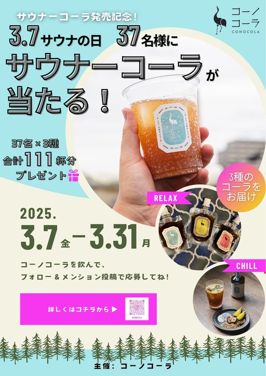 クラフトコーラを製造・販売するコーノコーラ(本社:愛知県名古屋市中川区、代表:河野大地)は、Makuakeで439%を達成した「サウナーコーラ」の新商品の発売を記念し、2025年3月7日(サウナの日)より「サウナの日コーラプレゼントキャンペーン」を開催いたします。