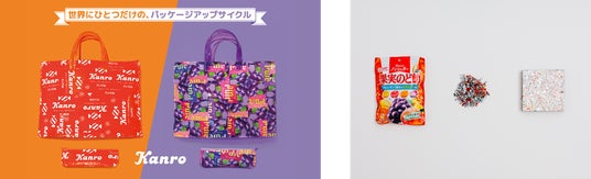 カンロでは、フューチャーデザイン事業の一環として廃棄包材のアップサイクルに取り組んでおります。製造工程上どうしても生じてしまう廃棄包材(年間約94トン/2023年実績)が課題となっており、商品パッケージに多く使われている複合フィルムや印刷されたフィルムは通常リサイクルが困難とされていましたが、デザインファーム「ペーパーパレード」と協業することで、廃棄予定のパッケージをそのまま活かし、アップサイクルした雑貨(バッグ、サコッシュ、ペンケース)の製作を行いました。クラウドファンディングのプロジェクトとしてスタートした後、ポップアップストアやオンラインショップでの販売を行うことで、ブランド価値向上にもつながっております。さらに、海洋プラスチックや施設・企業から出るプラスチックゴミをマテリアルリサイクルするスタートアップ企業「リマーレ」と協業し、カンロ商品の廃棄包材を粉砕・熱圧着して板状にし、建材等に応用できないか試作を行い、資源循環型社会実現を目指す取り組みも実施しています。