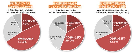オフィスでのガム咀嚼や音楽視聴は「賛成派」の人が多数!特に若い世代ほど前向きな傾向に。 約7割が集中の為のオフィスでのガム咀嚼に前向き、 約6割が集中の為のオフィスでの音楽視聴に前向きと回答。
