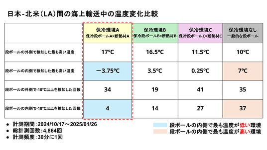 試行錯誤の末、保冷機能を備えた段ボールと断熱資材の組み合わせた候補A~Cと、保冷環境でない一般的な段ボールの4つ環境で海上輸送を実施。段ボールの外側と内側に温度ロガーを貼付し、30分おきの温度変化を計測しました。各環境での温度変化の総評を表した図が表1です。