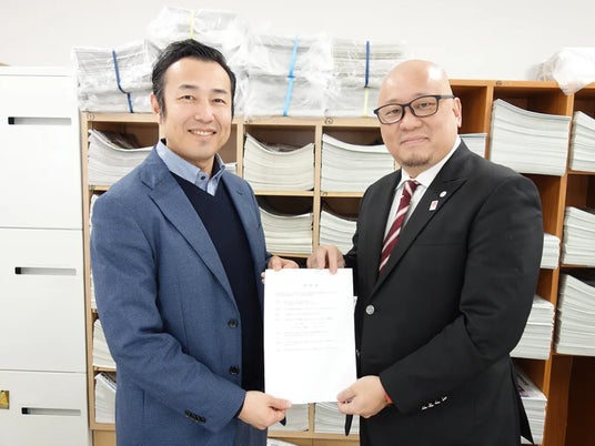 デジログを具体化させる事業連携協定を結んだ大阪日日新聞の佛崎編集長(左)と当社代表の清原義視(右)