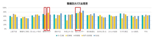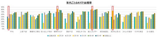 この理由として、経験不足による視野の狭さや柔軟性(フレキシビリティ)によって、職場の問題に順応しやすいことが要因と考えられます。若年層は課題を割り切って受け入れる傾向があるため、多くの項目で出現率が低い傾向があります。その中でも、「良かれと思ったオバケ」の出現率は比較的高く、周囲との認識のズレが起こりやすい傾向もみられます。