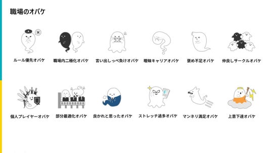 オバケは全部で12体おり、チームメンバーそれぞれの立場から職場で見かけたかどうかを回答し、職場やチームに潜むオバケを見つけていくことができる仕組みになっています。職場のオバケ探しでは、組織の課題をかわいらしい見た目のオバケとして表現することで、誰か1人のメンバーのせいにすることなく、全員が率直な意見を出し合いながら、職場改善や組織開発の取り組みを堅苦しくない雰囲気で行うことができるツールになっています。