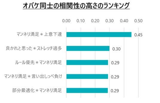 - 「マンネリ満足オバケ」とその他オバケとの相関性の高さ「マンネリ満足オバケ」と「上意下達オバケ」は、ワークフローが整備され型通りに動けば成果が出る職場に出現しやすい傾向がある。さらに、「マンネリ満足オバケ」は、変化を否定・拒絶する他のオバケと組み合わさることで、停滞的で改善が起こりにくい職場を生み出す要因となっている可能性があります。一方、「良かれと思ったオバケ」と「ストレッチ過多オバケ」は、高い目標達成のために顧客要望を過剰に受け入れる職場で出現しやすい傾向があります。