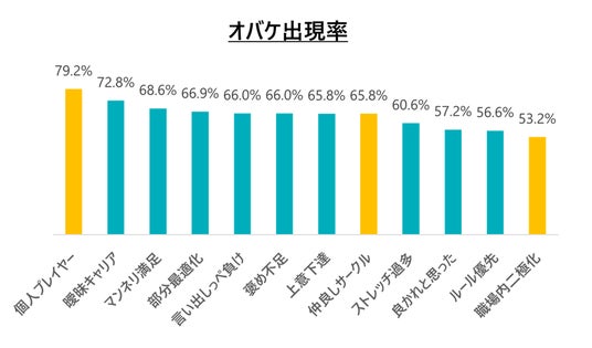 - また、同じく職場内の関係性に関するオバケである「仲良しサークルオバケ」では、「職場内二極化オバケ」に比べ10%以上多く出現している。職場内において意見の衝突がない、というのではなく、意見の衝突を避けている傾向があると解釈できる。