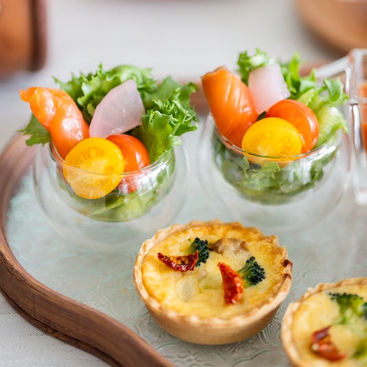 (上)スモークサーモンサラダ、(下)鶏とブロッコリーのキッシュ