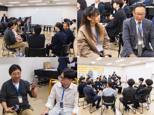 トークセッションで語られた「推し社長」についての考えを念頭に、今度は社長と学生が2グループに分かれグループディスカッションを行いました。テーマは「推したくなる社長は、どのような魅力やビジョンを持っているのか」。時折笑い声が聞こえる和やかな雰囲気の中、社長と学生が世代を超えて本音で対話を重ね、お互いの価値観への理解が深まっていく様子が印象的でした。