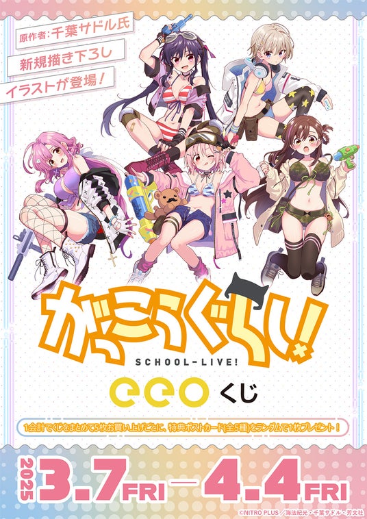 今回発売した「eeoくじ」の景品には、丈槍由紀たち学園生活部のみんなが水鉄砲を手にした“水着”テーマの描き下ろしイラストを使用。