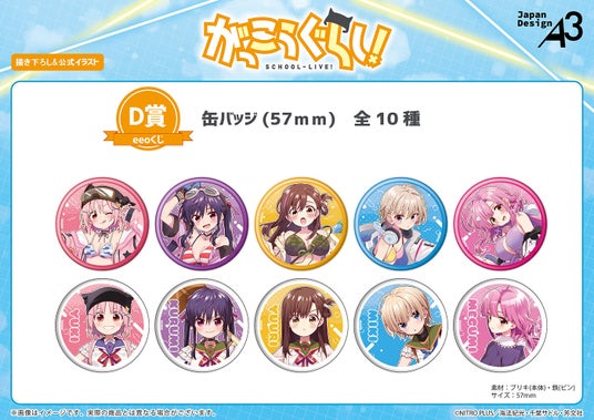 D賞の缶バッジは、公式イラストを使用したグッズ。大きさおよそ5.7cmで、カバンにつけてアレンジしたり、ラックに並べてコレクションを楽しんだりするのにぴったり!