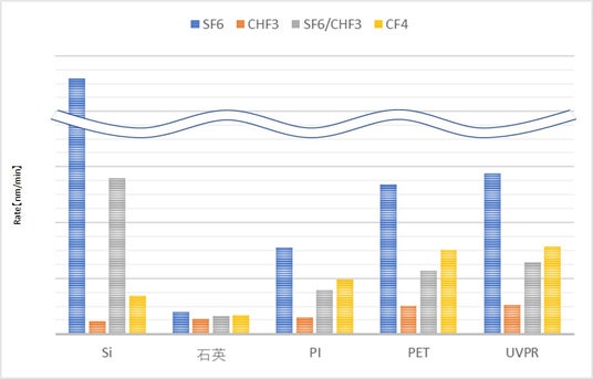 評価データ例(素材材質とガス種によるエッチングRATE比較)