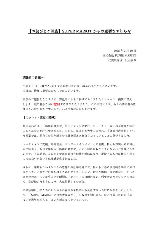 突然のご報告となりますが、弊社はこれまで掲げておりましたミッション「価値の最大化」を、誠に勝手ながら撤回する運びとなりました。この決定により、多くの関係者の皆様にご心配をおかけすること、心よりお詫び申し上げます。