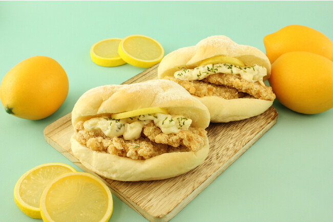 チキンフィレ竜田揚げにタルタルソースとレモンスライスをのせ、ふわふわの白パンにサンドしました。初夏の暑くなってきた時期にも、レモンの酸味で爽やかにガッツリ食べられます。
