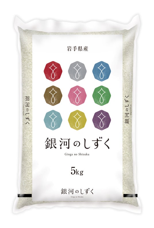 岩手県が10年もの歳月をかけて生み出したオリジナル品種「銀河のしずく」。名前の由来として「銀河」は、岩手県の詩人である「宮沢賢治」の作品のタイトルにも使用されていることから、「岩手」をイメージさせる言葉でもあるとともに、キラキラと光る星空から、お米一粒一粒の輝きをイメージさせます。「しずく」は、 このお米の特性である、つや、白さなど美味しさを表現しています。