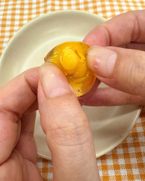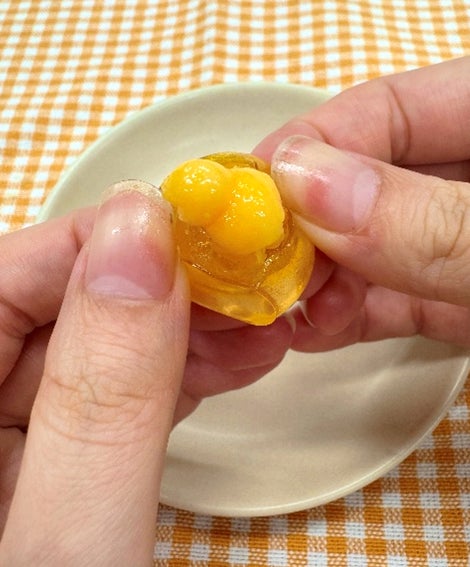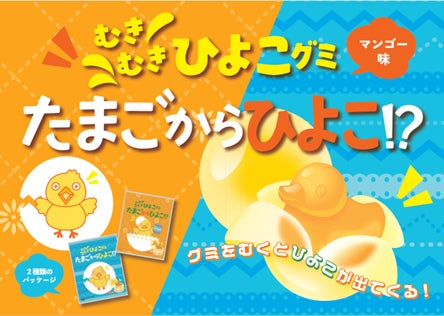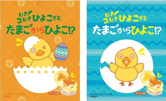 今回はたまごに見立てたグミを?くと、中から可愛らしいひよこ型のグミが出てくる、食べる前から楽しめる商品です。外側のグミは弾力のあるハード食感、内側のひよこ型のグミはゼリーのようなぷるぷる食感になっていてそれぞれ異なる食感が味わえます。剥いて外側と内側のグミを別々に食べるのはもちろん、そのまま食べて2つの食感を同時に楽しむのもおすすめです。