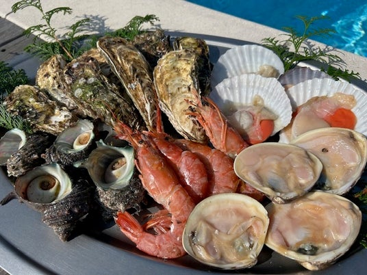 <内容>牡蠣/ハマグリ/ホタテ/赤エビ/サザエ/グラスフェッドビーフステーキ/野菜の盛り合わせ
