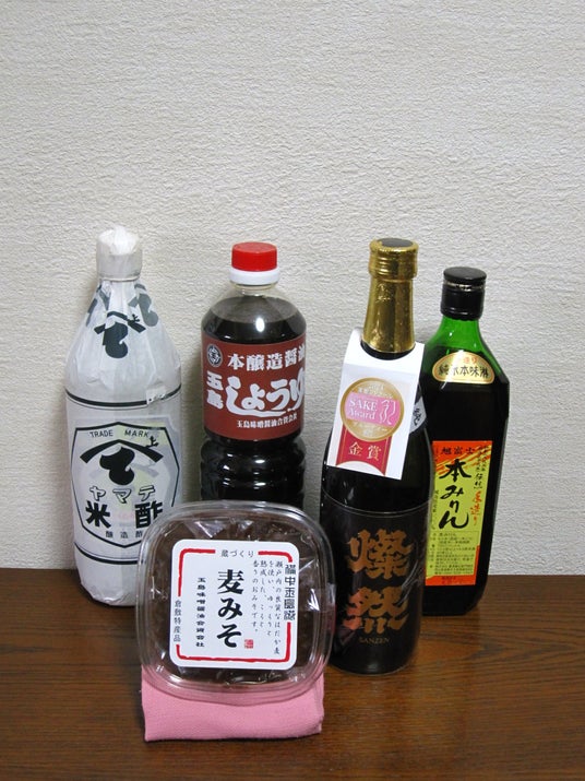 玉島で生産された、日本酒、味噌、醤油、本みりん、酢になります。このほか豆腐などの加工品も食材として活用します。
