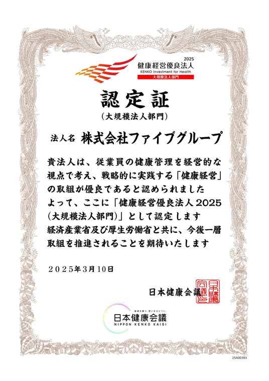 「”楽しい”でつながる世界をつくる」をミッションに、飲食店などを運営している株式会社ファイブグループ(本社:東京都武蔵野市 代表取締役社長:坂本憲史 以下ファイブグループ)は、2025年3月10日に経済産業省が推進する「健康経営優良法人2025」(大規模法人部門)の認定を受けました。この制度は従業員の健康管理を経営的な視点で考える健康経営を、戦略的に実践している法人を顕彰するもので、今年で8年連続での認定となりました。