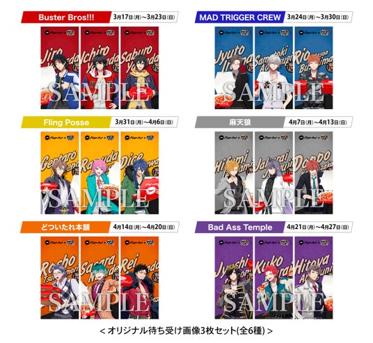 期間中に、ピザハットオンライン、またはピザハット公式アプリにて税込1,000円以上ご注文の際、指定のクーポン『【ヒプムビ】Web応募完了』をカートに入れてご注文された方の中から、抽選で各ディビジョン10名様、合計60名様に抽選でオリジナルアクリルスタンド3個セットが当たります。