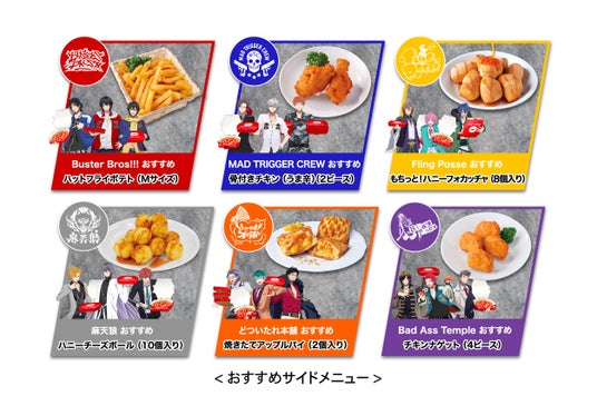 「ハットフライポテト(Mサイズ)」、「骨付きチキン(うま辛)(2ピース)」、「もちっと!ハニーフォカッチャ(8個入り)」、「ハニーチーズボール(10個入り)」、「焼きたてアップルパイ(2個入り)」、「チキンナゲット(4ピース)」の6種類