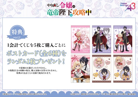 TVアニメ『やり直し令嬢は竜帝陛下を攻略中』の「eeoくじ」を1会計で5枚ご購入ごとに、ポストカード(全6種)をランダムで1枚プレゼント!