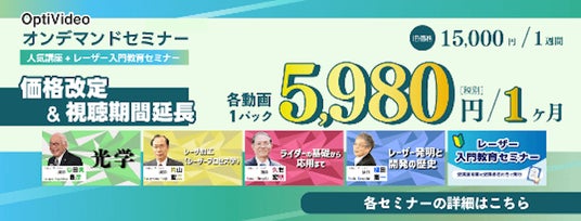 OptiVideoは、レーザーの専門家集団である当社が提供する定額制の動画配信サービスです。レーザー・光学の歴史や基礎に加え、LiDAR技術、レーザー加工、超短パルスレーザー(フェムト秒レーザー)といった最新のトレンド、レーザー核融合や光量子コンピュータ等、将来の応用技術、業界の著名な講師によるセミナー動画の独占配信、といった幅広いコンテンツを取り揃えています。