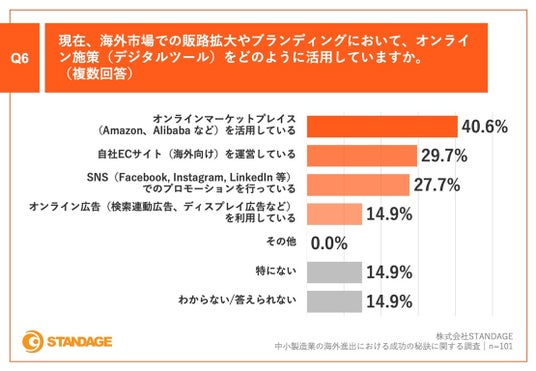 「Q6.現在、海外市場での販路拡大やブランディングにおいて、オンライン施策(デジタルツール)をどのように活用していますか。(複数回答)」(n=101)と質問したところ、「オンラインマーケットプレイス(Amazon、Alibabaなど)を活用している」が40.6%、「自社ECサイト(海外向け)を運営している」が29.7%、「SNS(Facebook,Instagram,LinkedIn等)でのプロモーションを行っている」が27.7%という回答となりました。