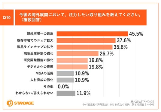 「Q10.今後の海外展開において、注力したい取り組みを教えてください。(複数回答)」(n=101)と質問したところ、「新規市場への進出」が45.5%、「既存市場でのシェア拡大」が37.6%、「製品ラインナップの拡充」が35.6%という回答となりました。