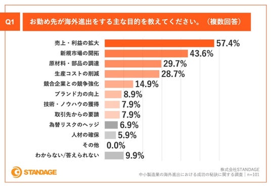 株式会社STANDAGE(本社:東京都港区、代表取締役 CEO:足立彰紀)は、海外進出して一定の成果を上げている(直近3年間の海外売上高が増加している)中小製造業(従業員数1,000名未満)の経営者・役員101名を対象に、中小製造業の海外進出における成功の秘訣に関する調査を実施しましたので、お知らせいたします。