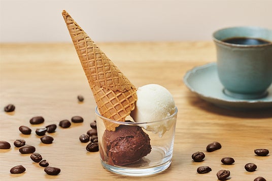 ダブルジェラート ワッフルコーン付きコーヒー豆と一緒に加熱して香り付けした牛乳から作ったオリジナルのバニラジェラートとチョコレートのジェラート。
