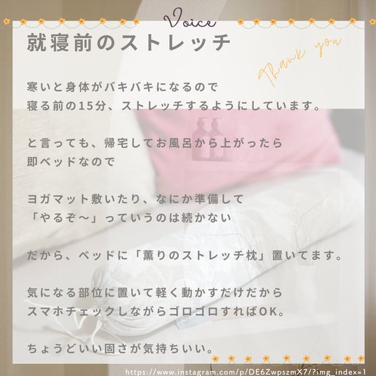 薫りに包まれ1日15分のストレッチ。筋肉をほぐし、快適な夜を。