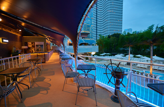プールの2階デッキテラスには、水着のままご利用いただけるプールサイドダイニング「アウトリガー」もオープン。ホテルメイドのハンバーガーや、アメリカンクラブハウスサンドウィッチなどを、海外リゾートのような非日常空間でお愉しみいただけます。プール全体を一望できる全長約12mのスタイリッシュなロングバーカウンターからは、ホテルバーテンダーによる本格カクテルも提供いたします。