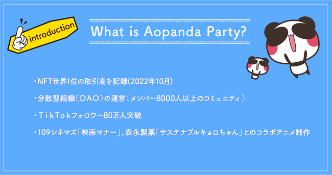 あおぱんだは、TikTokで80万人以上のフォロワーを抱える人気TikToker。最近では109シネマズ「映画マナー」映像や森永製菓「サステナブルキョロちゃん」とのコラボアニメ制作など幅広いジャンルの映像を制作している。